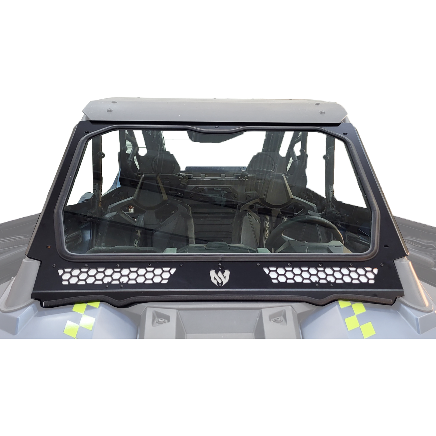 Black Full Glass Windshield for Polaris RZR PRO XP, Turbo R, and Pro R. Features the widest view possible offered in a aftermarket glass windshield. 2 Vent design at the bottom of the windshield that can be opened and closed to control air flow in the cab. Drastically cuts down dirt and dust in your face whole riding. Manual Windshield wiper included!