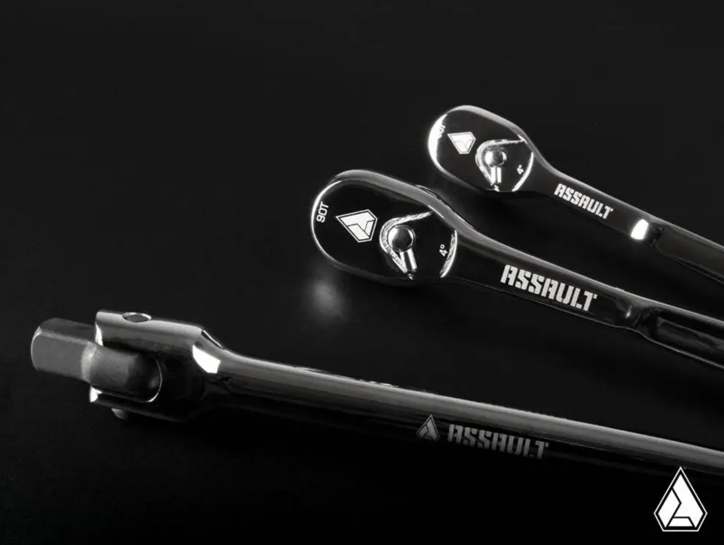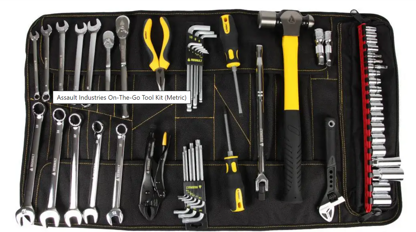 All tool kit components are premium grade and feature Assault Industries branding! The combination wrenches, while tucked into their pouches, display their respective metric sizes taking the guesswork out of making your selections. The new rebuildable ratchets feature an ergonomically designed handle, a smooth seamless anti-skip operation with the higher spec. 90T (90 tooth gear) and tiny 4-degree swing for working in tight spaces! The drivers have a hex base near the handle for additional torque with the help of a wrench! The ball-peen hammer has a long handle with a comfortable rubber grip. All tools come with a limited lifetime warranty! Don't get stuck unprepared! Assault Industries gives you all the tools you need to keep going!