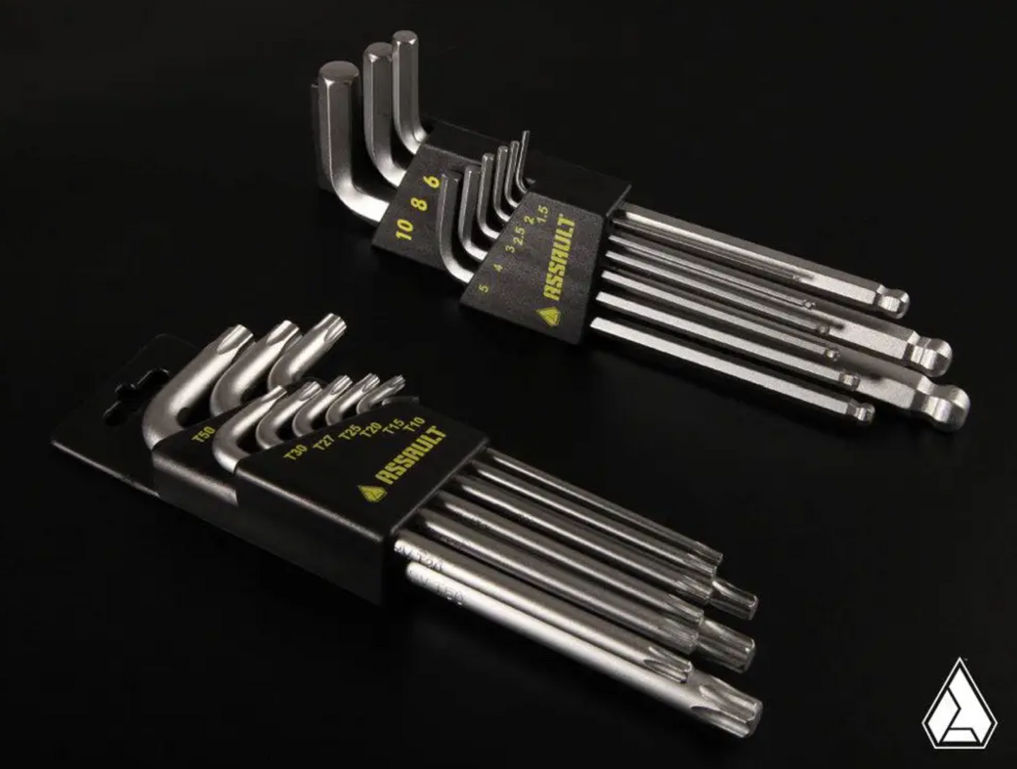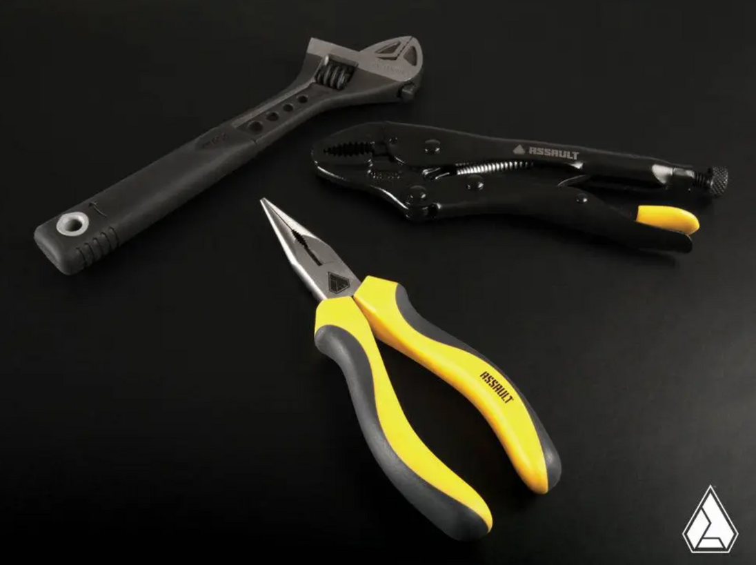 The Assault Industries On-The-Go Tool Kit is jam packed with the most common tools you'll need for your rig. The kit is curated with hand-selected tools used most often in the shop and on outings. This 62 piece kit is tailored to fit the needs of most UTV enthusiasts looking for a simple, lightweight solution that has everything to tackle most jobs, can be mounted or stored securely inside the vehicle, and doesn't make noise!