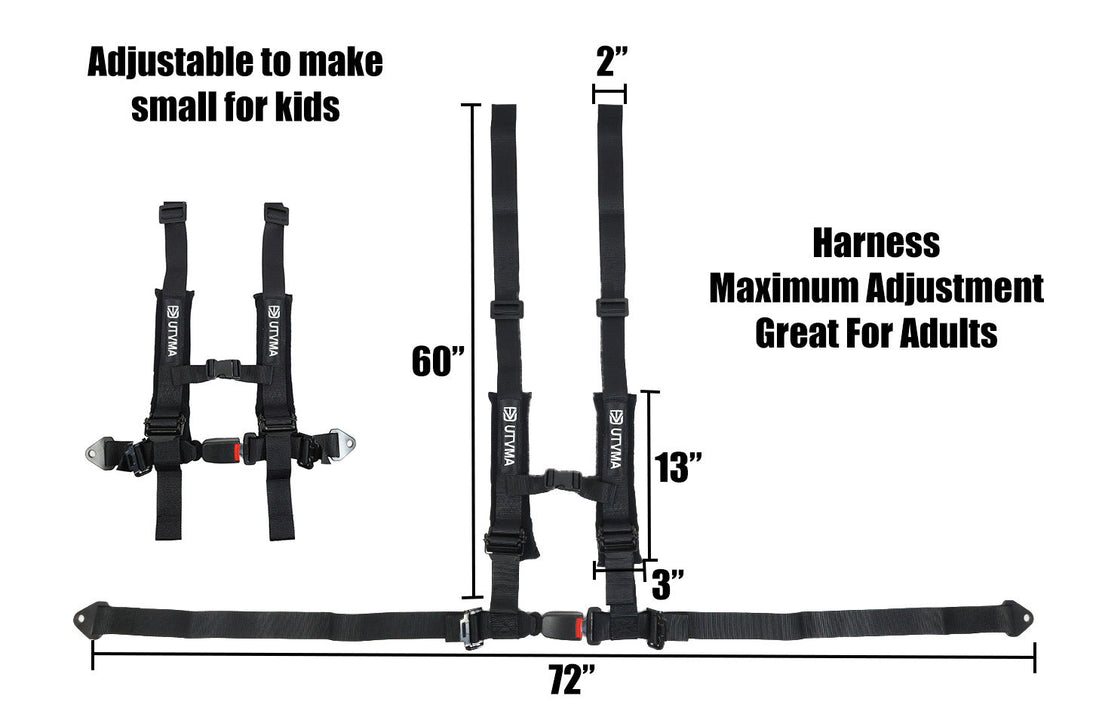 - (3) 4-point harness with sewn in harness pad and chest buckle